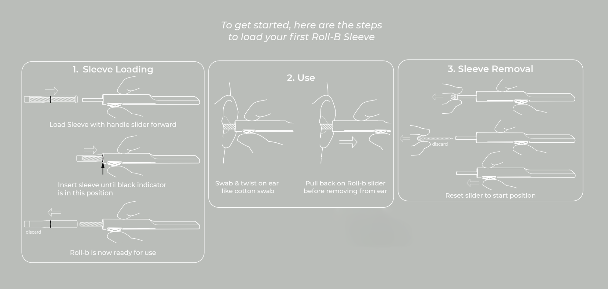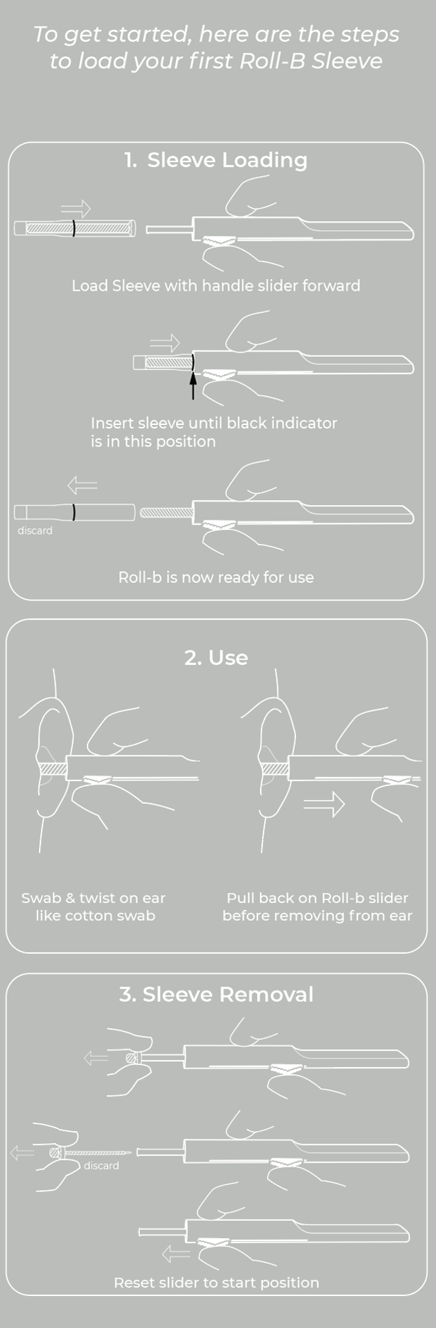 • LIMIT USE OF ROLL-B SWAB TO OUTSIDE SURFACE OF EAR AND OPENING OF EAR CANAL. DO NOT USE DEEP IN EAR CANAL.